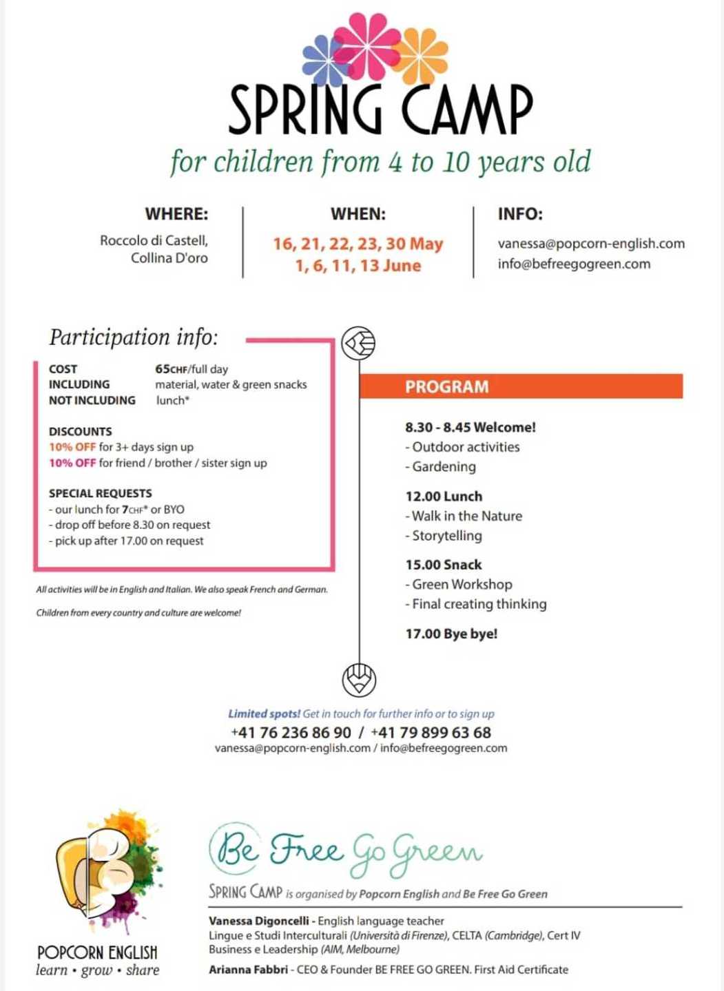We will start with some days between May and the beginning of June, to continue (except for new Federal and Cantonal regulations) with the Summer Green Camps starting from the end of the school year and for the whole summer.
